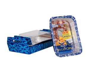 With this heavy-duty paperboard carrier, consumers can safely and comfortably transport their hot dishes to picnics, family gatherings, or the Sunday game. A four-corner beers style tray with fold-over double-layer handles, this design can hold twice the weight of the food that consumers can place in the pan. The system also includes a corrugated pad that insulates the hot pan and increases stability and strength of the paperboard tray—a feature not currently available in any other disposable aluminum pans on the market.