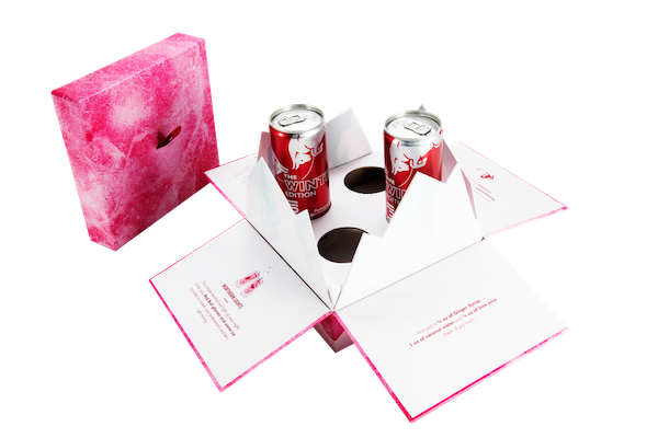 What grabbed the attention of the recipients, and our judges, was the attention to detail throughout the design. Swept away in bright pink frosty hues, the outer package encourages recipients to open the box and discover its surprise gift. As the cover is lifted on the inner box, four flaps drop-down revealing two cans of pomegranate-flavored Red Bull and two branded glasses nestled within the package while jagged mountain peaks form a wall. Clever copy invites the recipient to “get mixing” and unwind with a winter mocktail.
