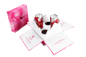 In the middle of a summer filled with record-breaking temperatures, you might need a trip to a snowy mountaintop. Taylor Box Company worked to transport consumers to colder weather with their Red Bull Winter Edition package. Swept away in bright pink frosty hues, the outer package encourages recipients to open the box and discover its surprise gift. As the cover is lifted on the inner box, four flaps drop down, revealing two cans of pomegranate-flavored Red Bull and two branded glasses nestled within the package while jagged mountain peaks form a wall. Clever copy invites the recipient to “get mixing” and unwind with a winter mocktail. Cheers!