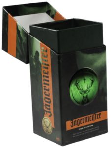 JohnsByrne Co. designed this glow-in-the-dark Halloween Jagermeister gift carton. A push-button LED light illuminates an eerie stag logo on the front panel while Frankenstein imagery, including orange eyes and a sutured mouth, haunts the rest of the box.